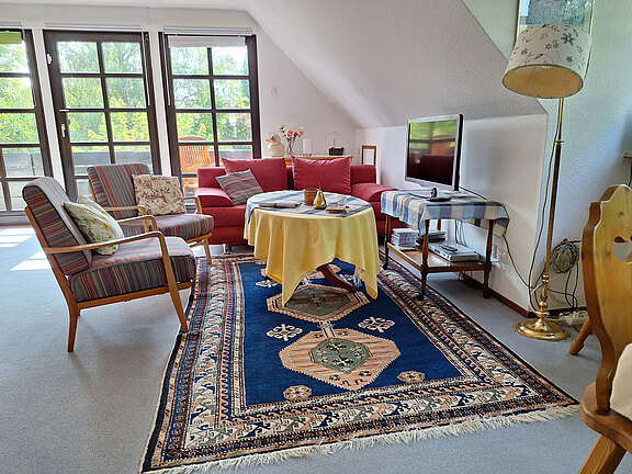 Das geräumige Wohnzimmer verfügt über einen sonnigen Südbalkon, ein weiteres Doppelbett sowie eine Schlafcouch, die zusätzlichen Gästen Platz bietet.